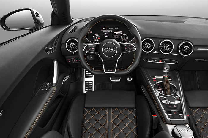 جای تعجب نیست که داوران این رقابت تحت تاثیر طراحی داخلی TTS قرار گرفتهاند. کیلومترشمار و نمایشگر دور موتور سنتی، جای خود را به نمایشگر مخصوص آئودی با نام کابین مجازی داده است. پنل ابزار این خودرو شامل دکمههایی است که با آنها میتوان وضعیت دمای داخل خودرو را تنظیم کرد. از طرفی طراحی یکپارچهی کابین باعث شده است که بزرگتر به نظر برسد.