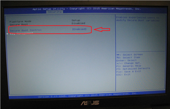 جهت رفع این مشکل نوت بوک را روشن کرده و با کلید F2 وارد تنظیمات بایوس شوید. در قسمت Security گزینه Secure Boot را فعال کنید. (Enabled)